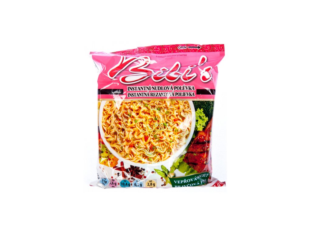 nudle (90.1%): pšeničná mouka, částečně ztužený rostlinný palmový olej, škrob,sůl, stabilizátor Trifosforečnan (E 451i), kypřící látka Uhličitan draselný(E 501), uhličitan sodný (E500), antioxidant Butylhydroxyanisol (E 320),antioxodant Butylhydroxytoluen (E 321).Koření (9,9%): sůl, cukr,rostlinnýpalmový olej,cukr, látka zvýrazňující chuť a vůni Glutamát sodný (E 621), látkazvýrazňující chuť a vůni Inosinát sodný (E 631), látka zvýrazňující chuť a vůniGuanylát sodný (E 627), antioxidant Butylhydroxyanisol (E 320), antioxodantButylhydroxytoluen (E 321), koření, přírodní kouřová příchuť, sušená jarnícibulka, umělá vepřová příchuť 0.002% (ječmen, sojový bob)