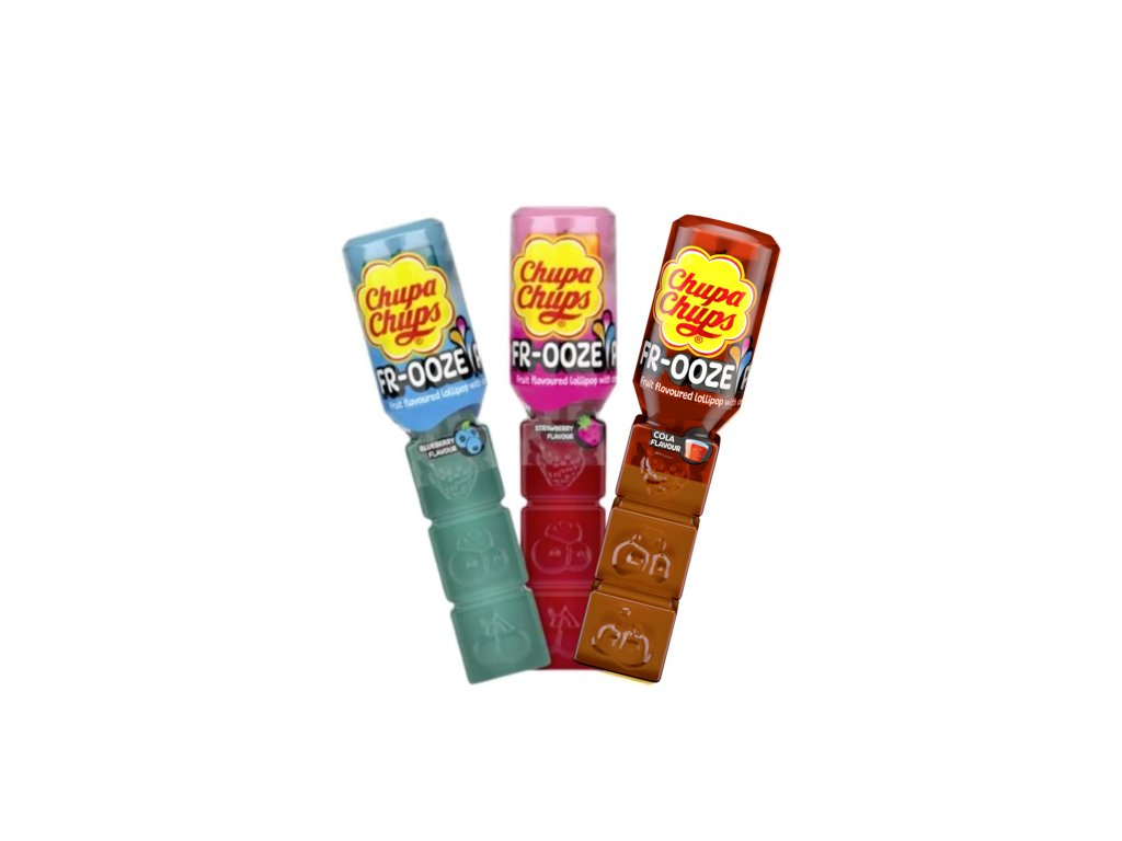 Chupa Chups lízátka s gelovou náplní s příchutěmi - jahoda, borůvka, cola.