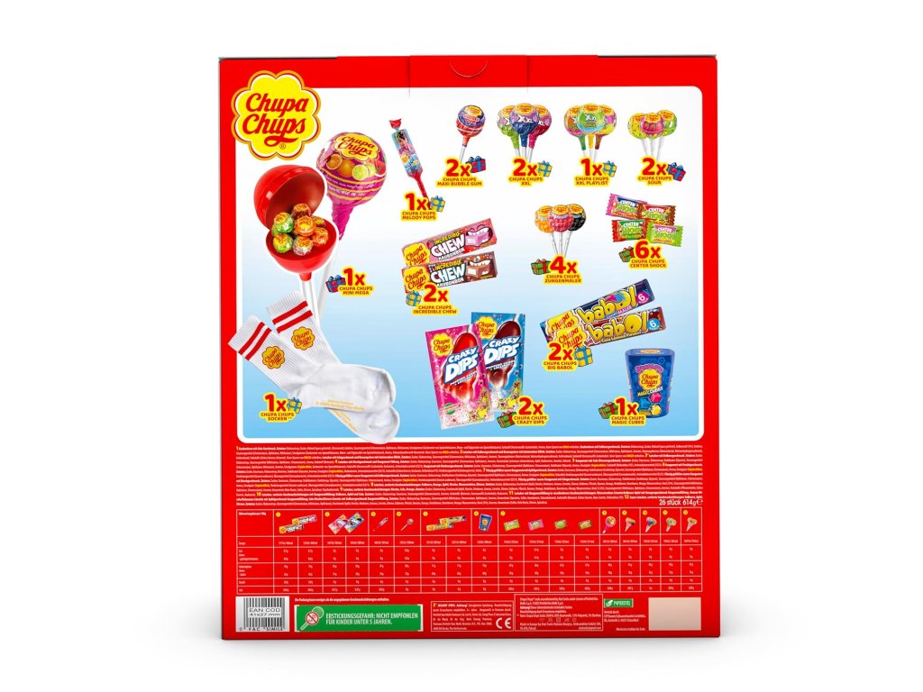 Adventní kalendář od Chupa Chups s 24 překvapeními v podobě lízátek a žvýkaček v barevném vánočním designu: S lízátky v různých velikostech