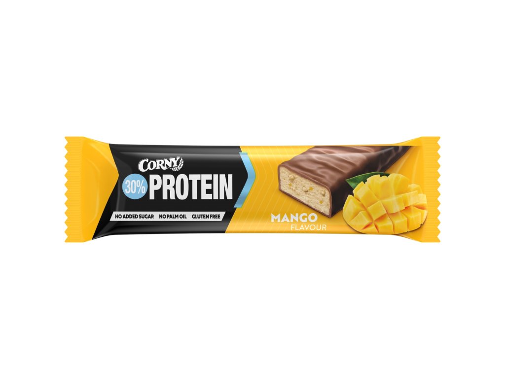 - Proteinová tyčinka s mléčnou čokoládou a mangem, se sladidlem.