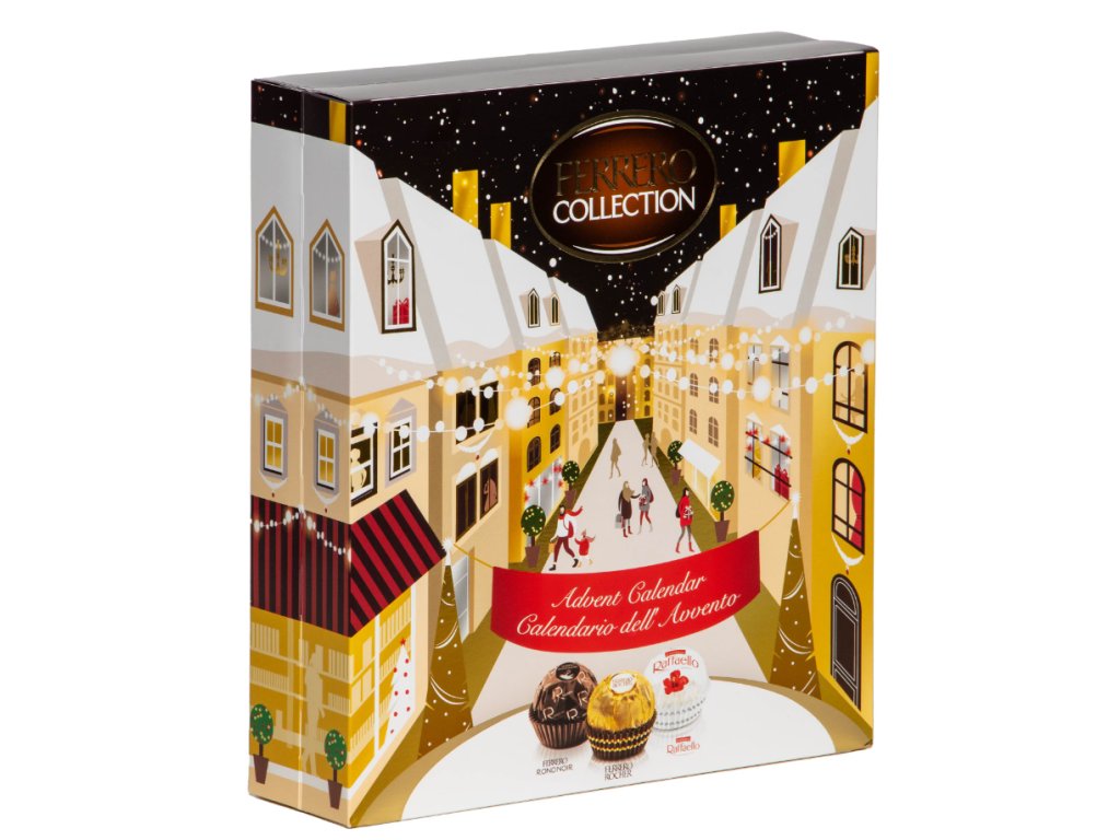 Kolekce tří druhů pralinek Ferrero v dárkové krabici. Ferrero Rocher, Ferrero Rondnoir a Raffaello.