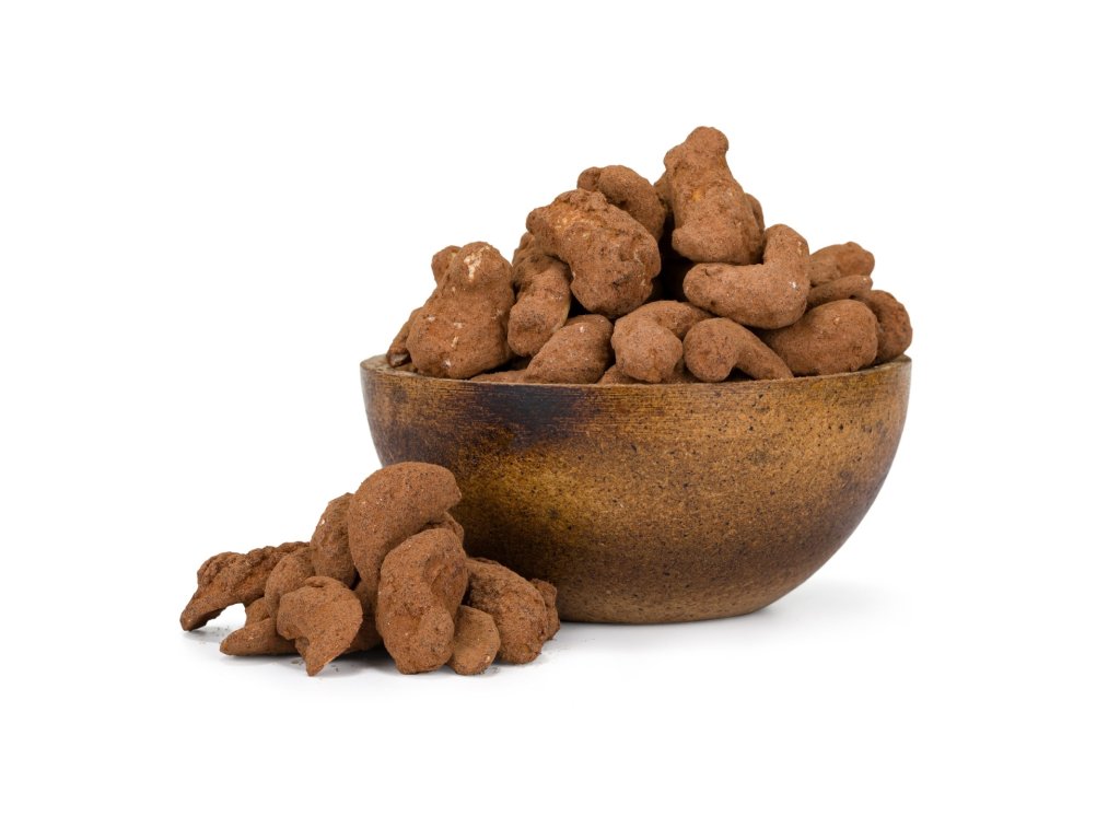 karamelizované kešu s kakaem. Samy o sobě samozřejmě chutnají famózně, ale chybu neuděláte ani tehdy, když se je rozhodnete