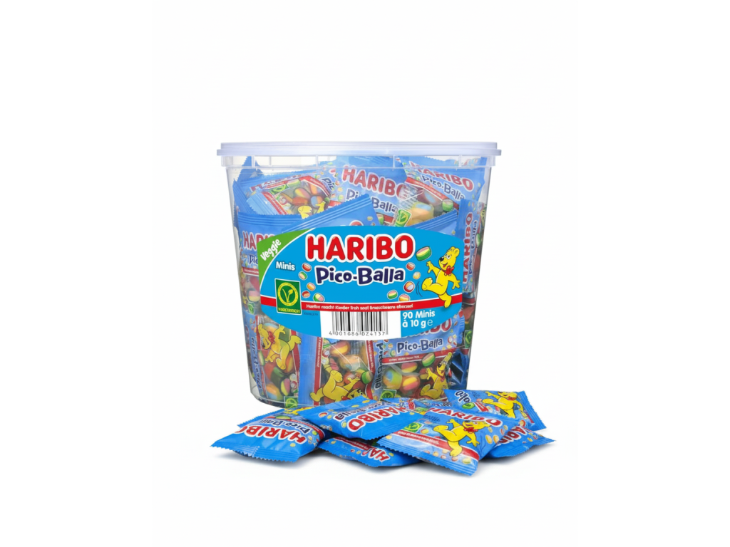 Haribo Pico-Balla je všestranná pochoutka. Tento ovocný bonbon s oboustrannou náplní v sobě spojuje tři příchutě v jedné malé pochoutce. Ať už je to jablko-ostružina-citron, jahoda-lesní plody-pomeranč nebo citron-lesní plody-pomeranč – tyto malé pochoutky vás překvapí svou ovocnou chutí a jemnou texturou.