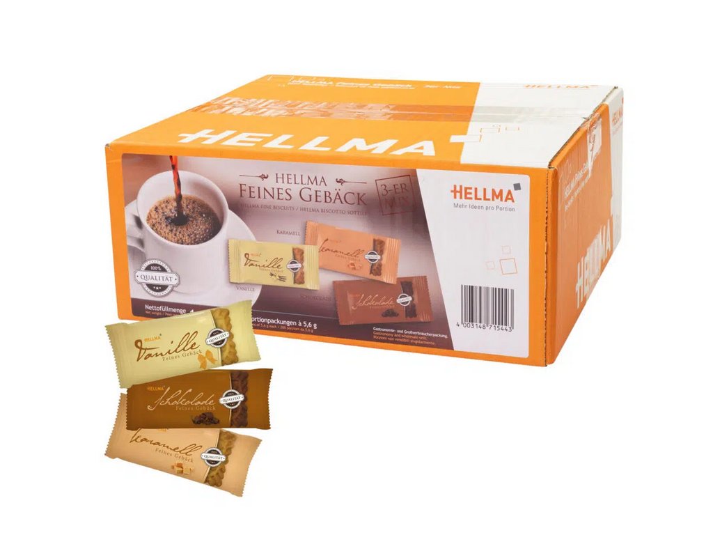 Jemné pečivo řady 3 Mix jsou individuálně balené sušenky ve třech různých příchutích: Vanilka, karamel a čokoláda. Nabízíte tak svým zákazníkům velkou rozmanitost. HELLMA Jemné pečivo se neomezuje pouze na karamel, ale nabízí další dva druhy, takže si zákazník může vychutnat široký výběr. Výrobek padne do oka a potěší patro.