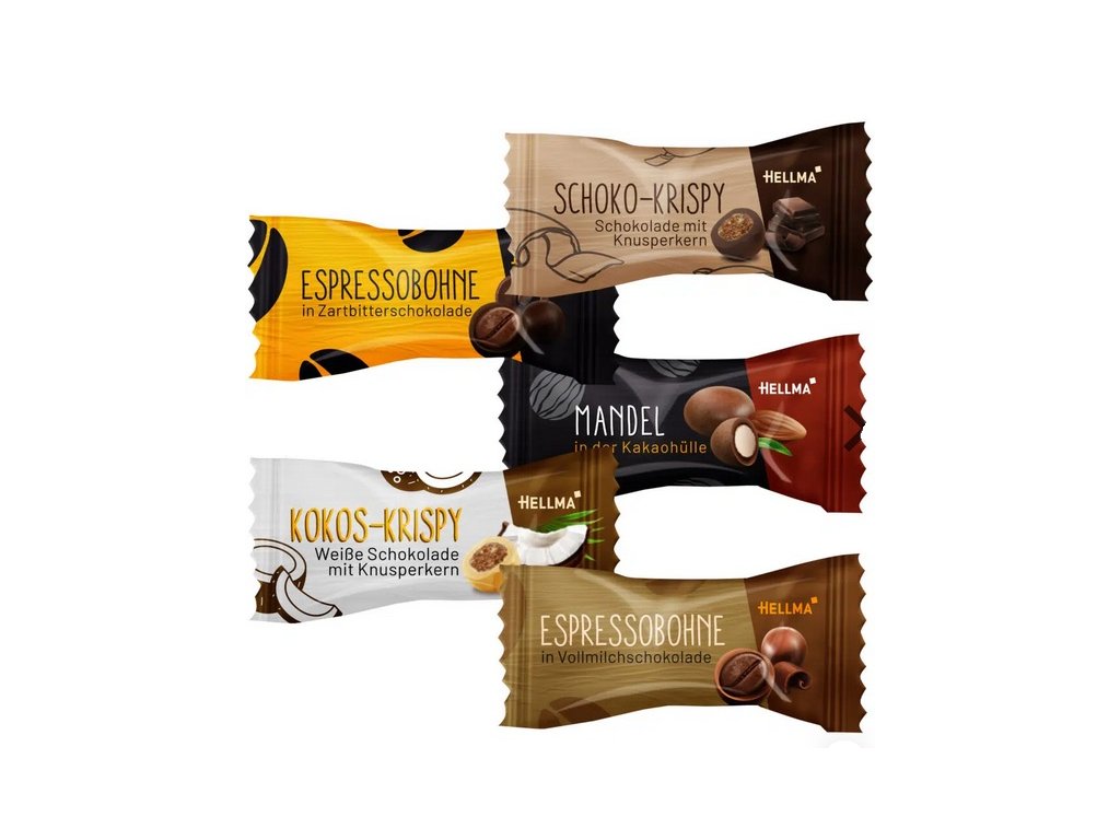 HELLMA Selection - uvnitř atrktivního balení najdete 40 porcích pěti různých druhů . Díky velkému výběru různých variant chutí nabídnete zákazníkovi obzvláště velkou rozmanitost chutí. Jednotlivě zabalená lahodná a bezlepková čokoládová směs je ideální pro kavárny, gastro nebo hotelnictví. Ať už jako doplněk k šálku horkého nápoje nebo jako dáreček v hotelovém pokoji. HELLMA potěší srdce