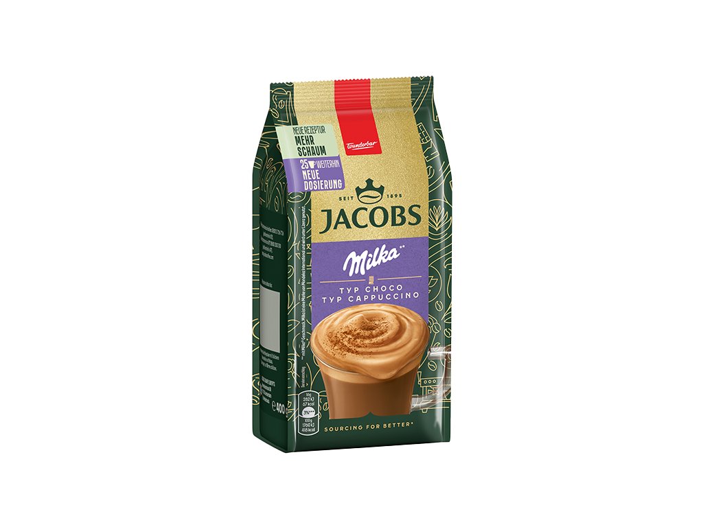 Jacobs Cappuccino Milka Choco instantní káva 400g přináší sladký chuťový zážitek, který harmonicky spojuje vůni kávy a jemnou