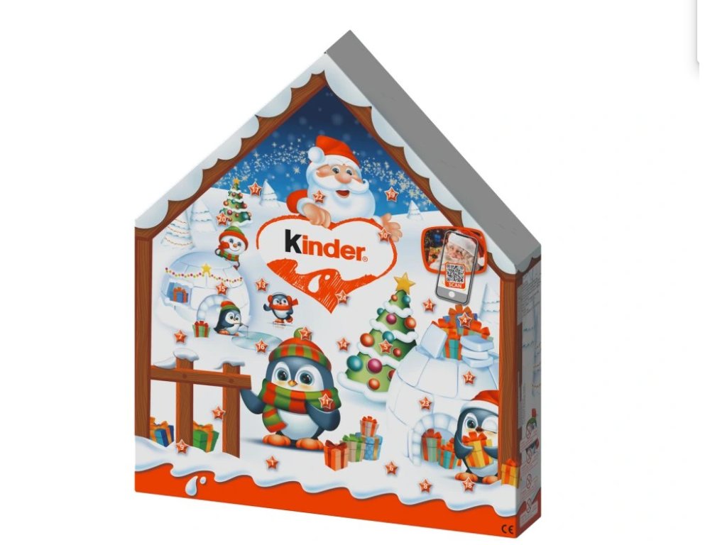 Adventní kalendář ve tvaru domečku. Obsahuje 2x Kinder figurku Mikuláše, 9x Schoko-bons, 9x mini vajíčko s mléčnou náplní, 3x kinder čokoláda a 1x Kinder vajíčko s překvapením
