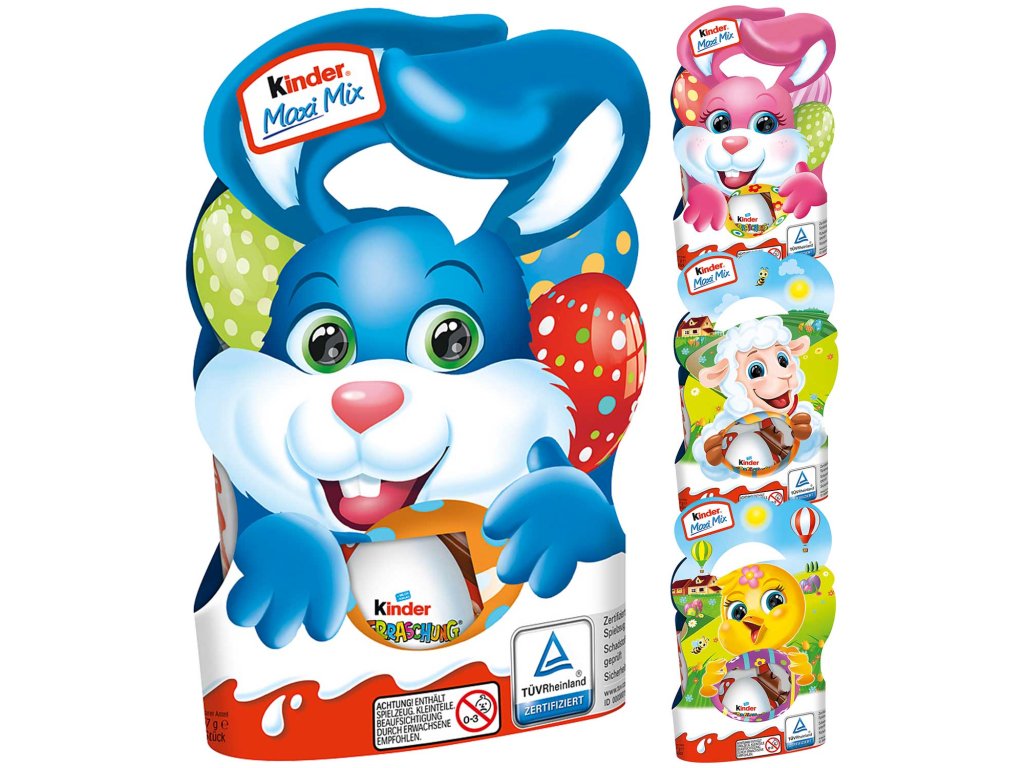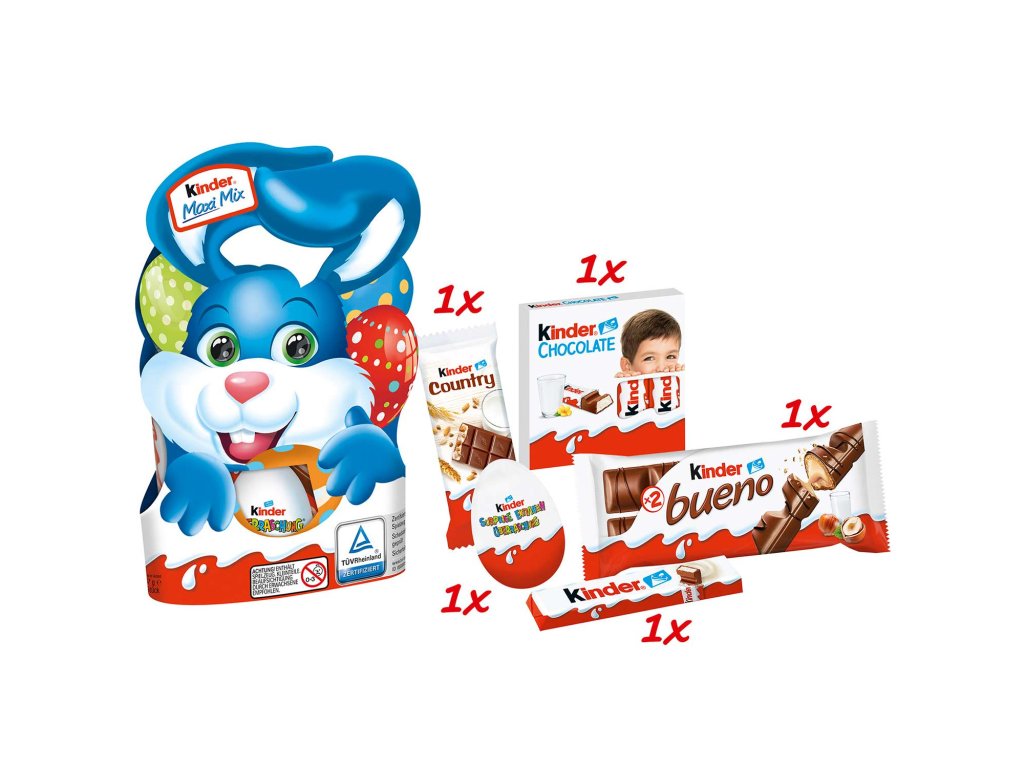 Balení obsahuje: Kinder Surprise- vajíčko s překvapením, Kinder Country- mléčná čokoláda,Kinder Chocolate Maxi- tyčinka z mléčné čokolády,Kinder Bueno-oplatka s polevou,Kinder Schoko- Bons- čokoládové bonbóny.