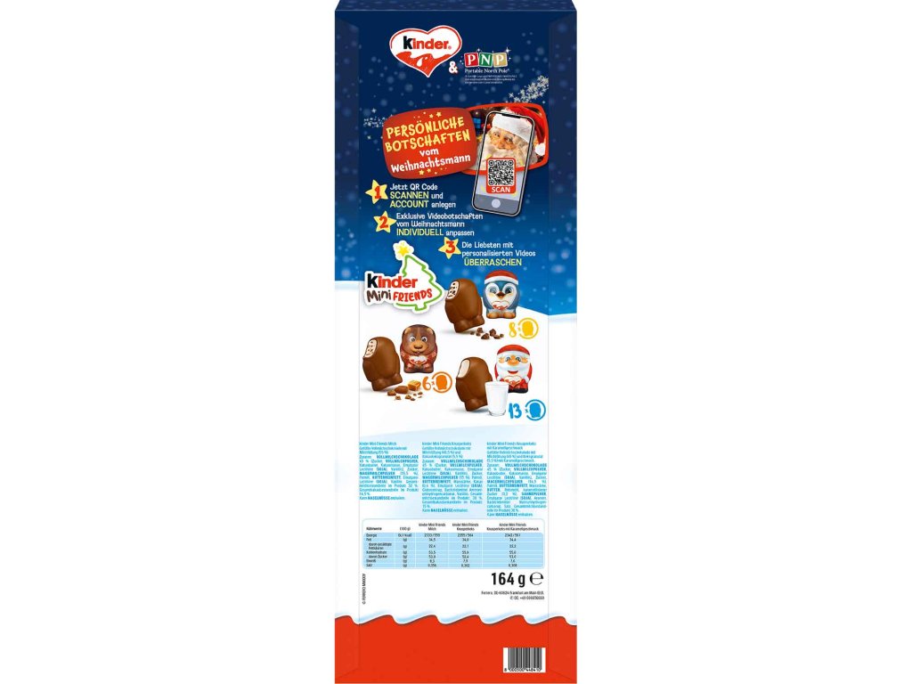 Součástí jsou Kinder Mini Friends Milk ve tvaru Santa Clause, Kinder Mini Friends Crispy Cookies s jemnou krémovou náplní ve tvaru tučňáka a