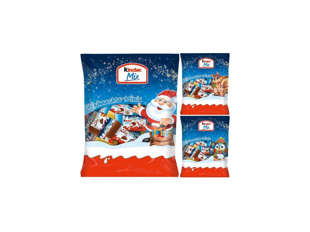 Obsahuje mini verze oblíbených čokoládových cukrovinek od Kinder - Kinder Bueno mini, Kinder country mini, Kinder čokoláda mini. Čokoládky mají vánoční motivy.