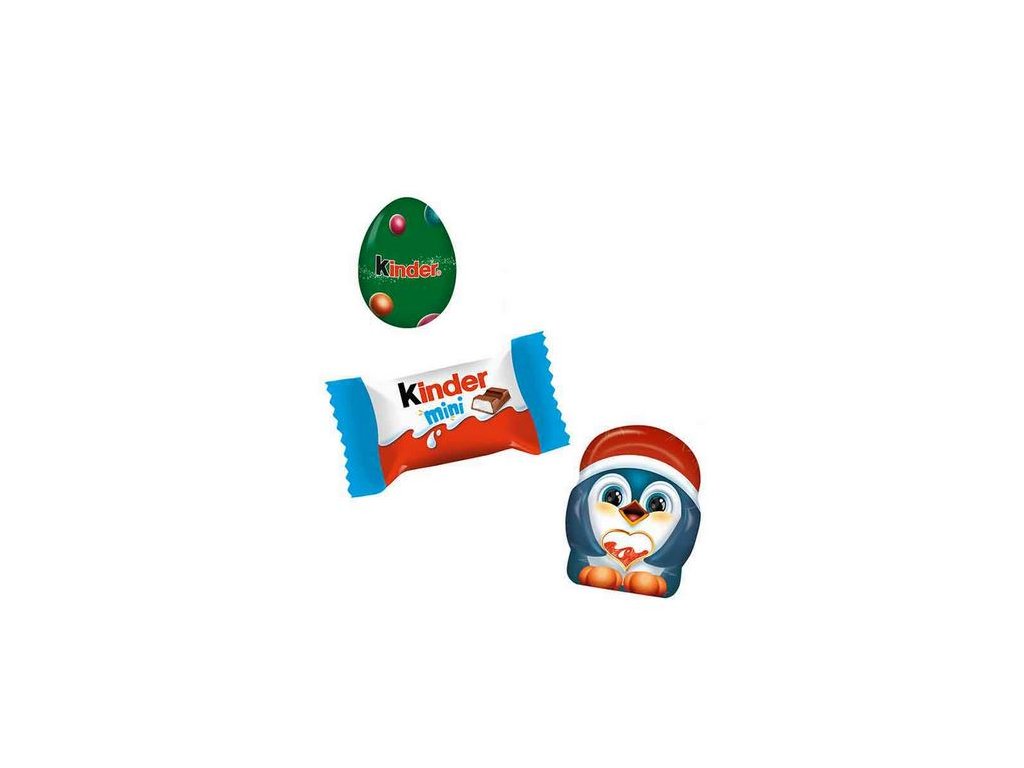 Mini-dárek s vánočním motivem Santy – ideální jako malá pozornost v adventní sezóně. Uvnitř je lahodný výběr populárních Kinder výrobků: křupavé Kinder Friends cookie s čokoládovým krémem, Jemné Kinder mini vejce s lískooříškovou náplní a několi Kinder mini čokoládek