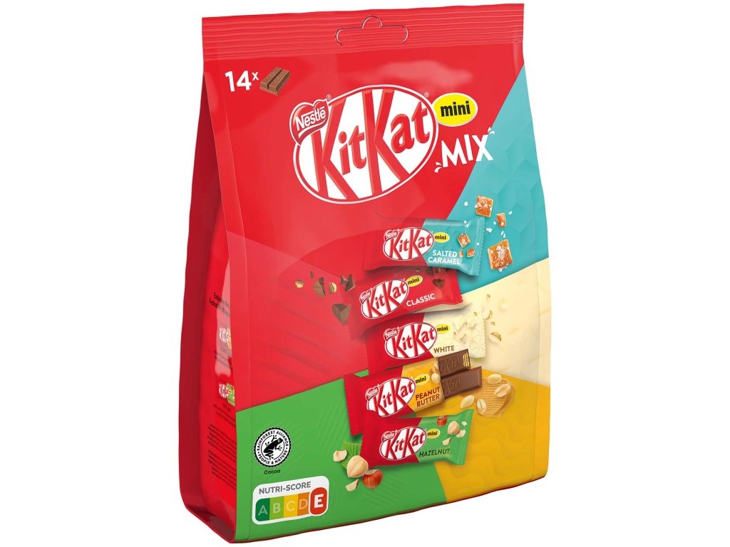 Konečný mix pro všechny fanoušky KitKat! Se skvělým KitKat Mini MIXEM na něj přijde každý. V této skvělé směsi na vás čeká oblíbená křupavá vafle v druzích classic, salted caramel, white, peanut butter a hazelnut. Úspěšný výběr, který splní každé přání. Balení obsahuje 14 jednotlivě balených mini tyčinek.