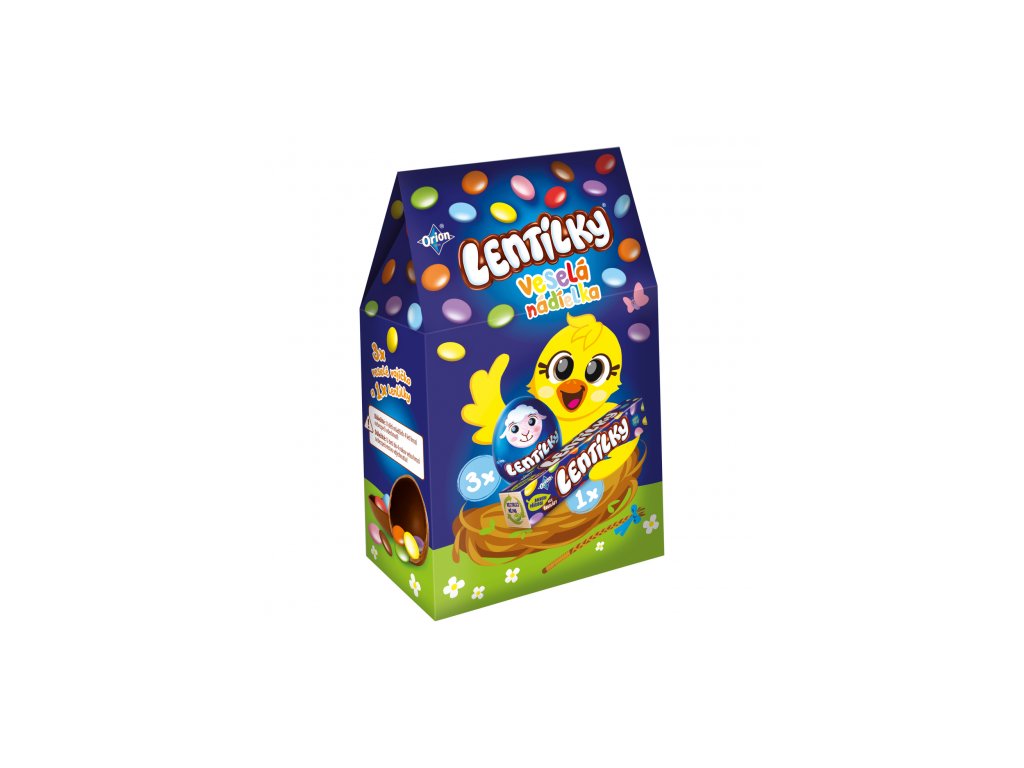 Oblíbené Lentilky v balení s kuřátkem pro velikonoční nadílku. Balení obsahuje 3x čokoládové vejce a 1x balení lentilek.