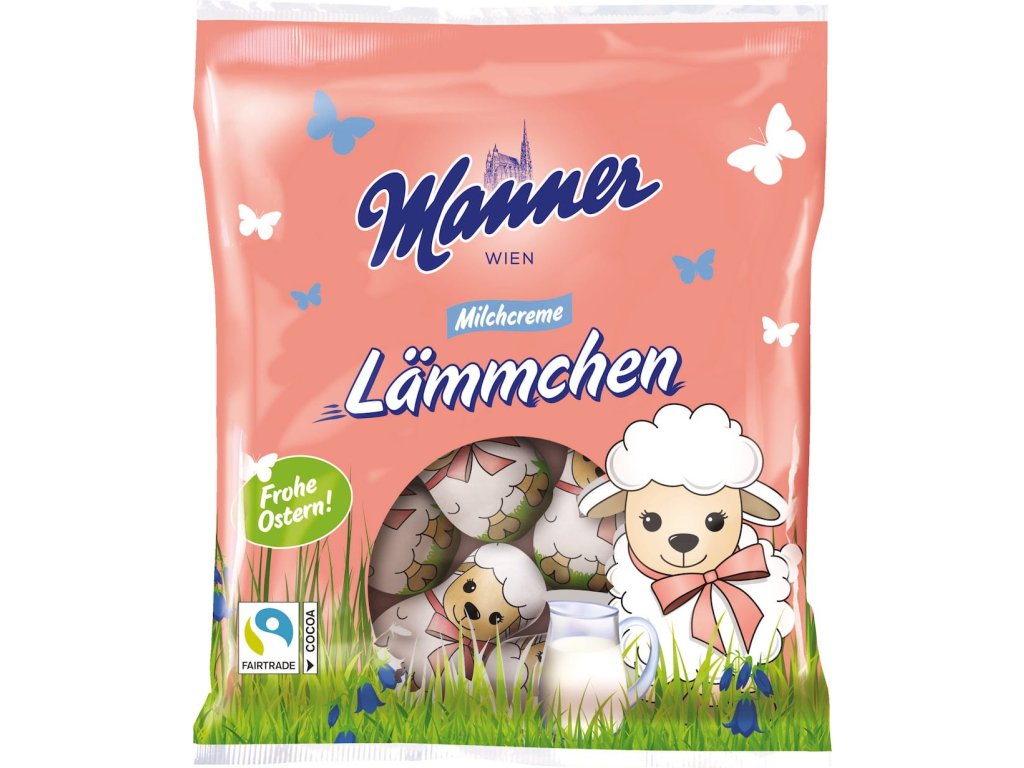 Na velikonočním festivalu by kromě zajíčků neměli chybět ani jehňata. Manner Milchcreme Lammchen s jemnou mléčnou