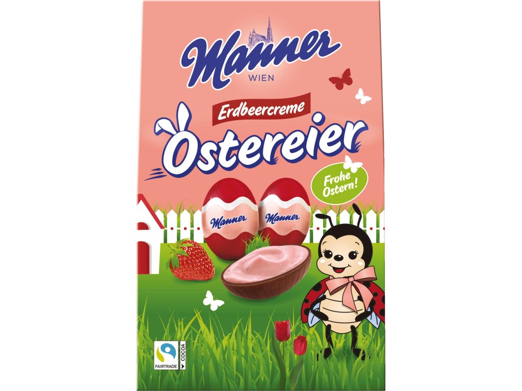 Krémová velikonoční vajíčka Manner Jahodová jsou plněná ovocným krémem a jsou proto jarní pochoutkou, kde svítí nejen sluníčko!