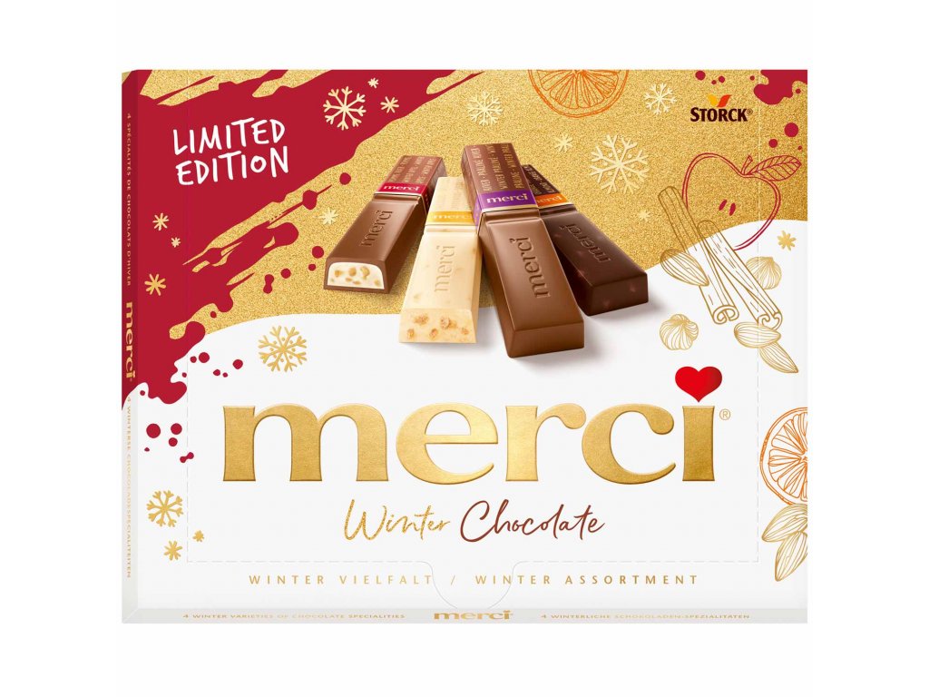 Merci přichází se speciálním zimním potěšením! S lahodnou zimní limitovanou edicí Merci Winter Chocolate můžete očekávat 4 nejjemnější čokoládové výtvory, které jsou ideální pro chladné období. U chutí zimní praliné, spekulatius, zimní jablko a mandlový pomeranč se můžete těšit na zdařilý výběr, který navodí pravou vánoční atmosféru s jemně vyladěným kořením.