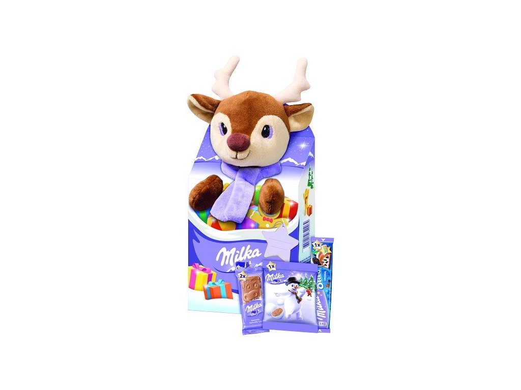 a v zavazadlech má sladkosti od Milky. Čekají na vás dvě lahodné tablety krav Milka, taška mini sněhových koulí a bar Milka & Oreo.