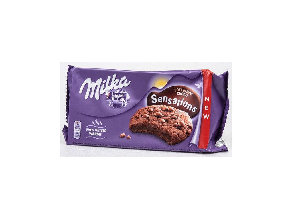Kakaové sušenky s měkkým středem a kousky mléčné čokolády z alpského mléka (20 %).• Milka Sensations Cookies All Choco měkká a vláčná,