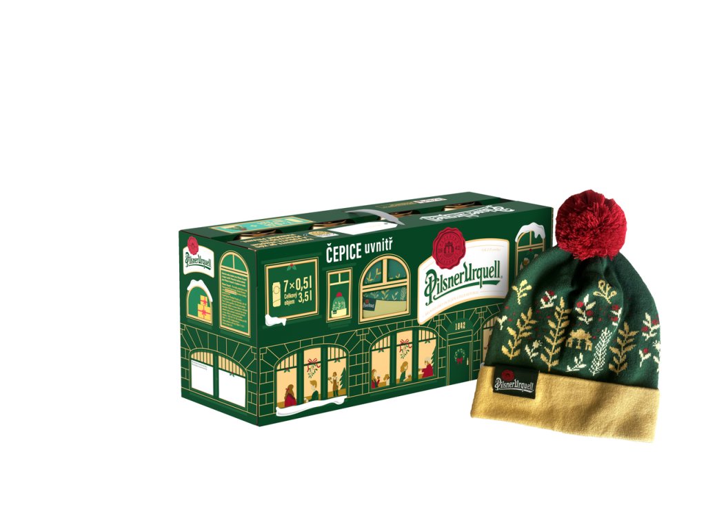 Vánoční edice balení piva Pilsner Urquell s čepicí uvnitř.