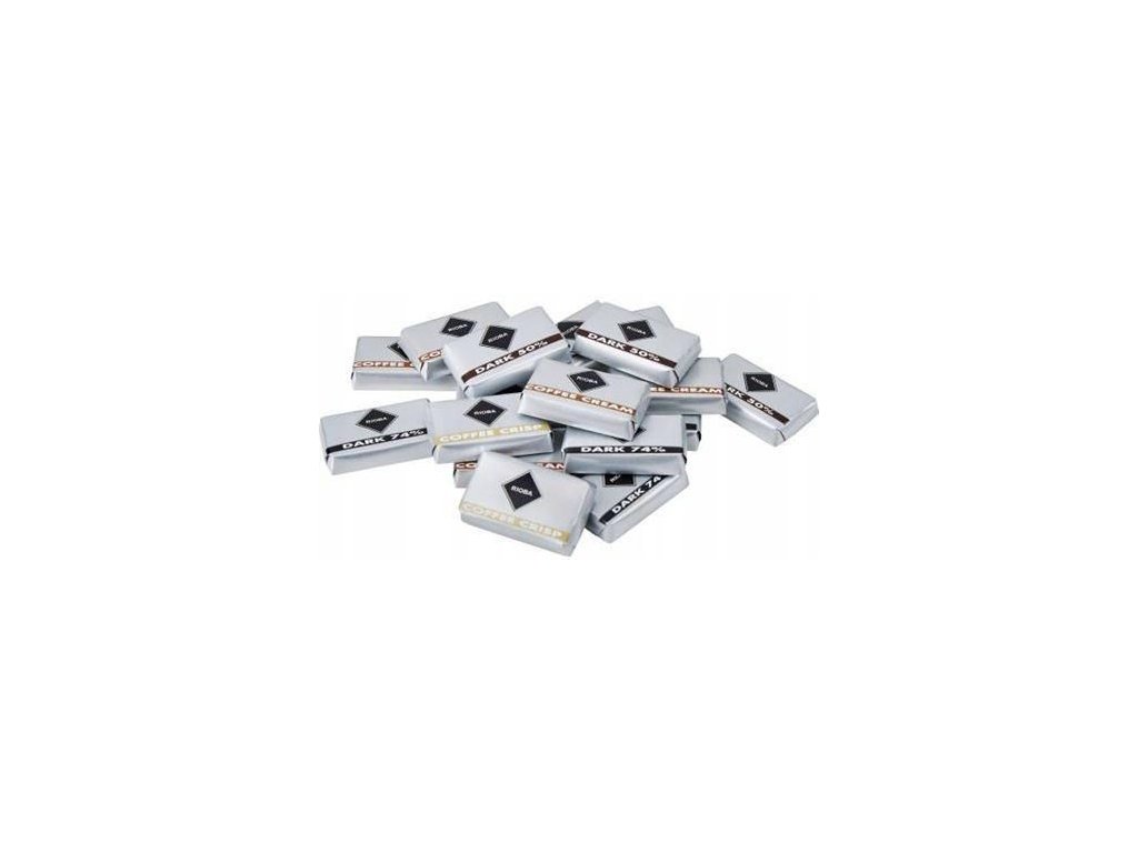 Prémiová švýcarská čokoláda v mini provedení s logem RIOBA, jednotlivě balené po 4-5g.