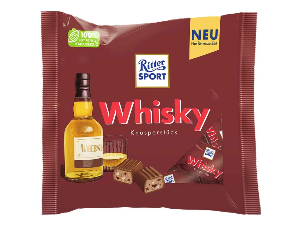 Jemná mléčná čokoláda plněná lískooříškovým krémem s rozinkami namáčených ve whisky s kousky oplatek a pufovanou rýží.