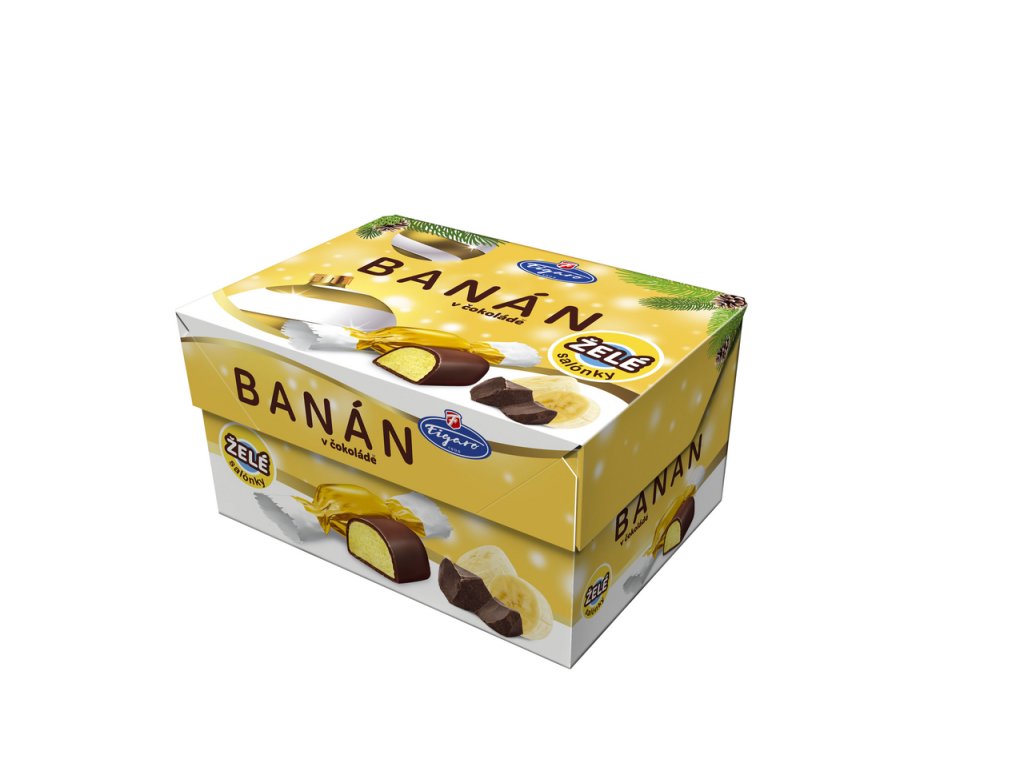 Banánové želé salonky (81%) v kakaové polevě. Složení: cukr, glukózový sirup, kakaová poleva (19%)