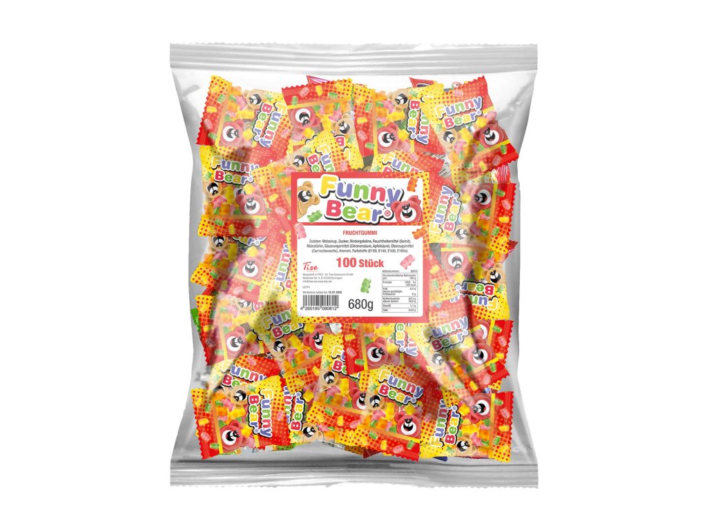 Složení: glukózový sirup, cukr, hovězí želatina, zvlhčovadlo (sorbitol), kukuřičný škrob, acidifikátor (kyselina citronová, kyselina jablečná),